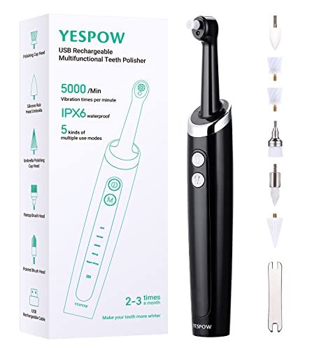 Electric Tooth Polisher - USB-Rechargeable Teeth Polishing Kit for Teeth Whitening, YESPOW IPX5 Waterproof Dental Polisher for Tartar Stain Removal, Teeth Polisher with 5 Heads for Plaque Removal